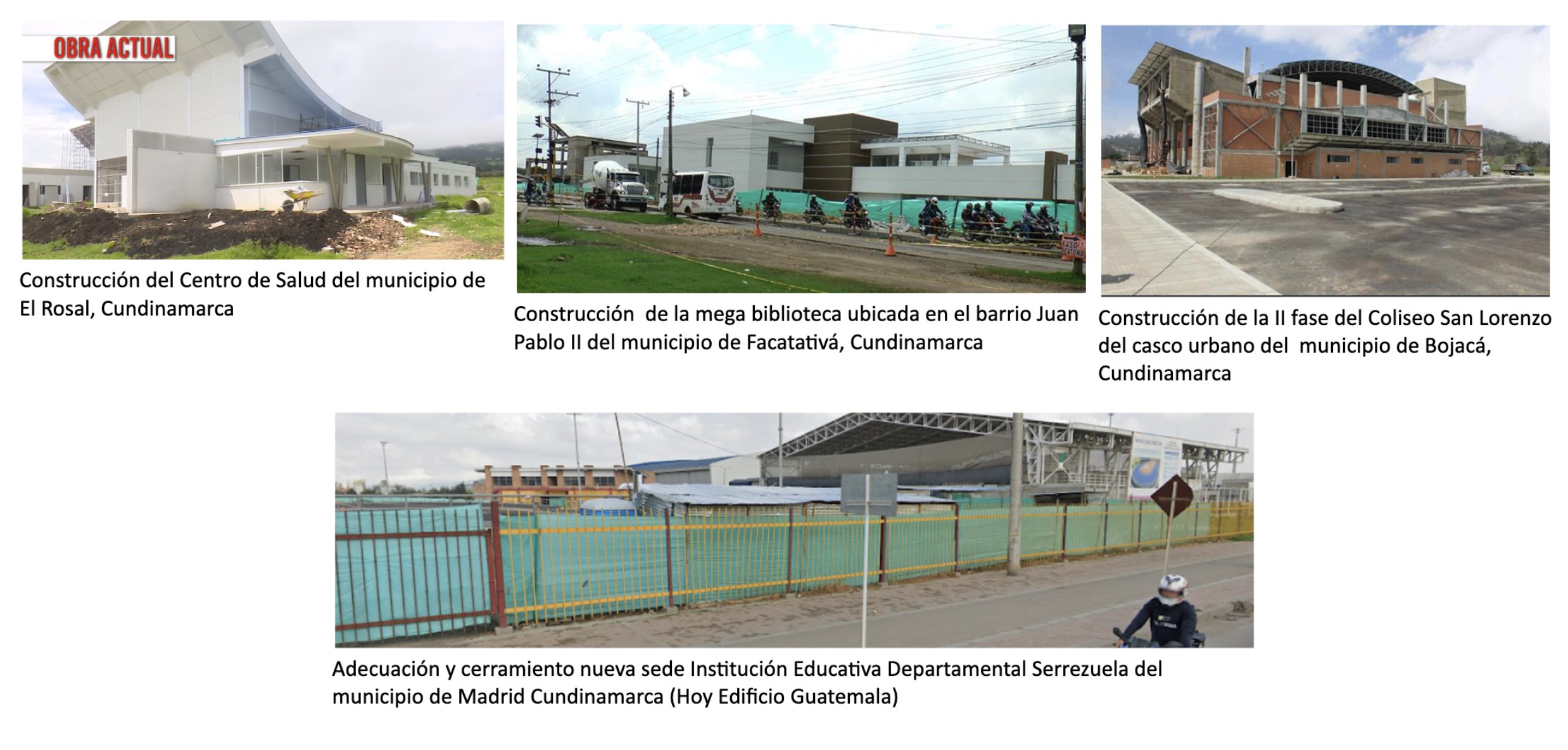 Así lo público el ente de Control en sus redes sociales oficiales. hizo seguimiento a obras inconclusas en Cundinamarca. Aprobó mesa de trabajo para revisar estado de las obras reportadas como inconclusas en Facatativá, El Rosal, Bojacá y Madrid y estudiar medidas para darlas al servicio, y asumir las investigaciones respectivas.
