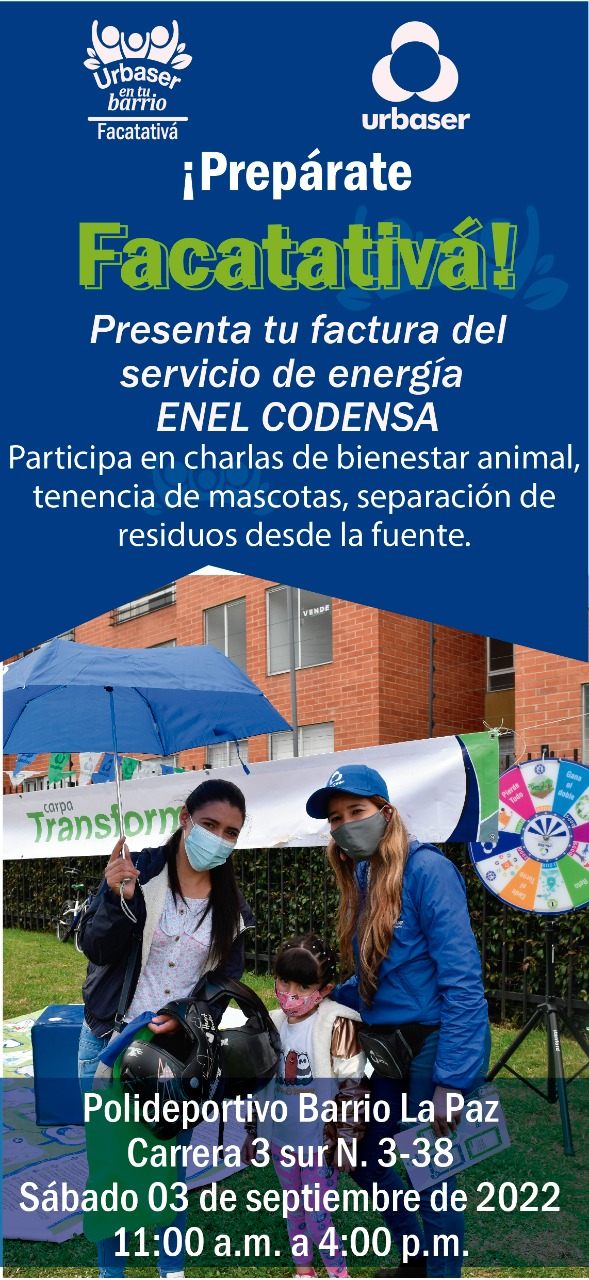 Durante la actividad puedes participar de actividades relacionadas con la tenencia responsable de mascotas, separación de residuos desde la fuente y consejos ambientales, que efectúan nuestros aliados ambientales como eeecotips, Alcaldía de Facatativá, EkoBojacá, RecoPack, Casa Marsupialls, greenfuel Colombia, la CAR y el apoyo de la Junta de Acción Comunal Barrio La Paz, también puedes presentar tu hoja de vida y participar en los procesos de selección para cargos operativos y administrativos. Si llevas a tu mascota para la vacuna contra la rabia, preferiblemente llévalo con bozal. No olvides presentar tu factura y participar en sorteos y entrega de premios que Urbaser lleva para ti. Como puedes ver, es una jornada es un espacio familiar lleno de diversión que pueden aprovechar niños y adultos. Te esperamos.