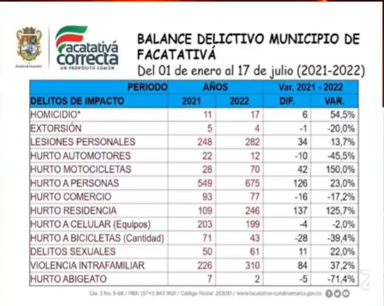 Así lo demuestra este balance presentando por el Director de Seguridad Jairo Montealegre en algunas sesiones en el Concejo Municipal el pasado 22 de agosto, los delitos más recurrentes en el informe son el homicidio, extorción, lesiones personales, el hurto a residencias y al comercio, según los datos suministrados por la misma alcaldía.