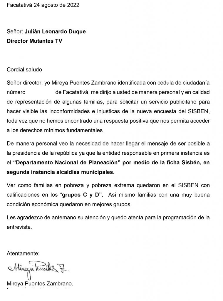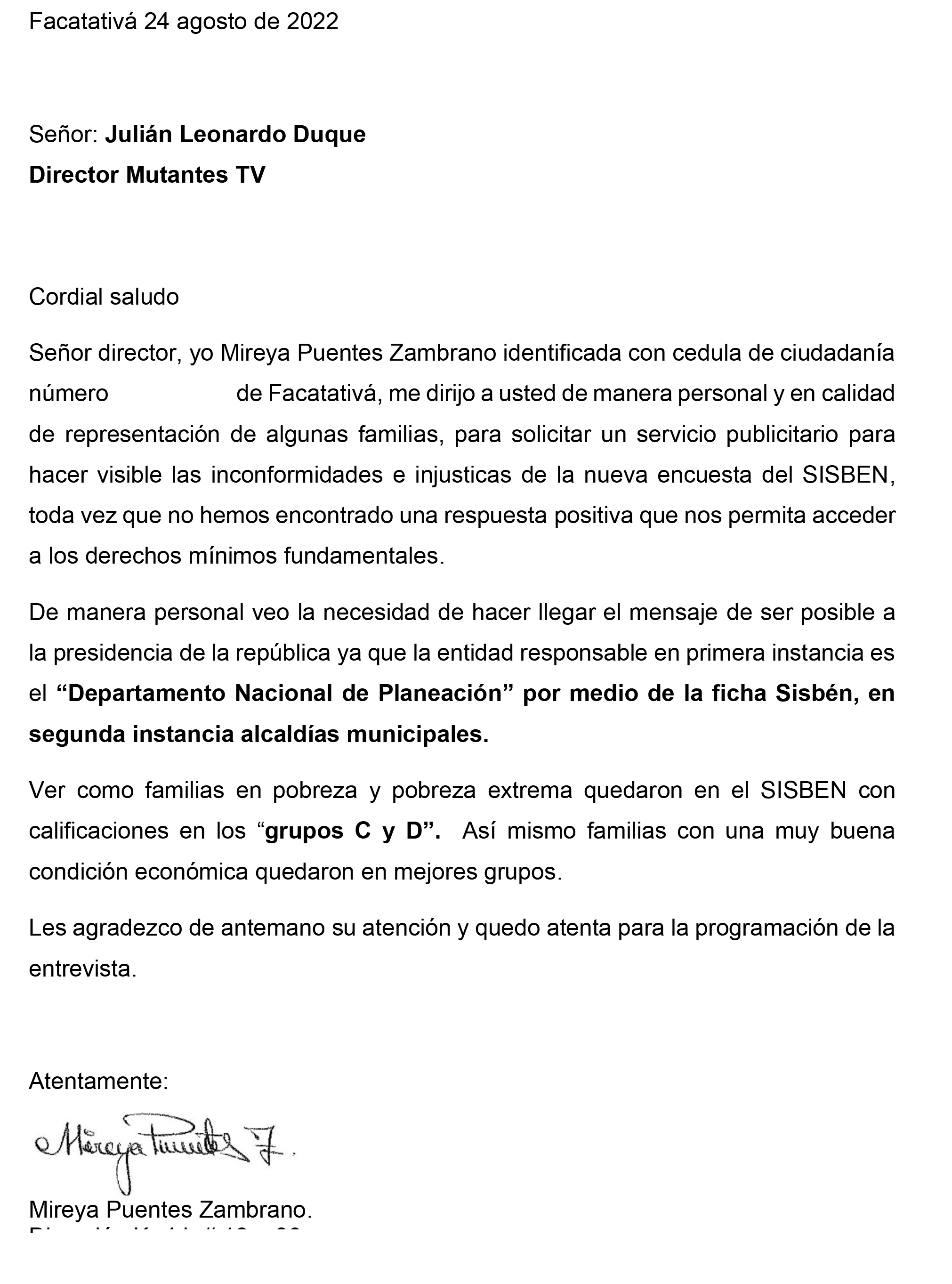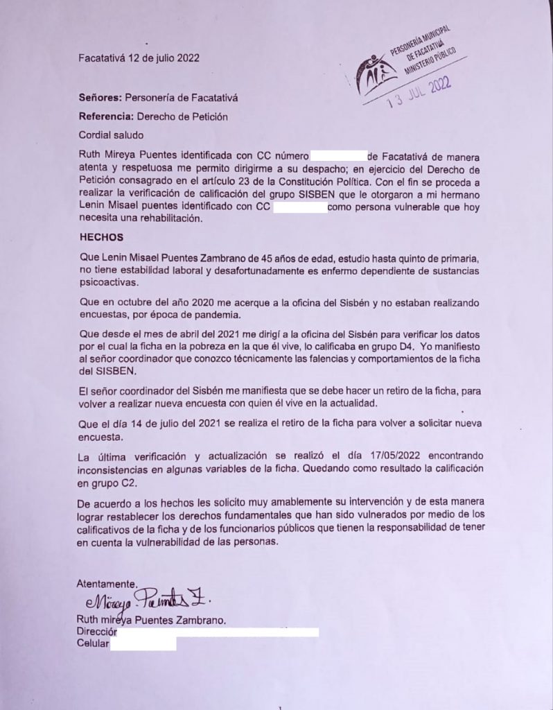 De igual forma relata la historia de su propio hermano el cual fue perjudicado por el Sisbén en Facatativá, según la exfuncionaria la calificación que recibió su familiar no es apta debido a que presenta problemas con sustancias psicóticas y su condición es de pobreza extrema, a otras personas que no tienen este tipo de enfermedades o que no están en condiciones vulnerables se les otorga el sisbén con una calificación que no es la adecuado pues pueden pagar un sistema de salud y no deberán estar en el régimen subsidiado expreso Mireya Puentes, por este caso Mireya paso algunos derechos de petición a la Personería Municipal y a la Procuraduría .