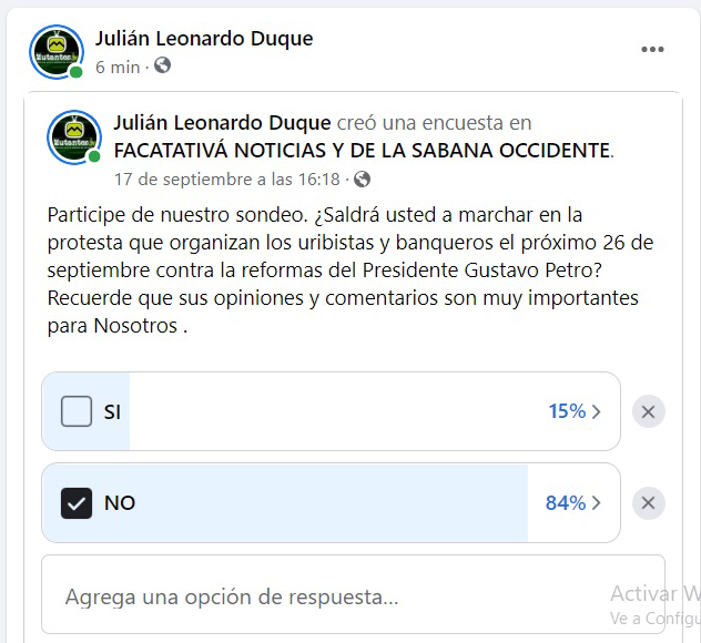 Facatativá, según sondeo de Mutantes Tv facatativeños NO apoyaran marcha uribista del 26 de septiembre