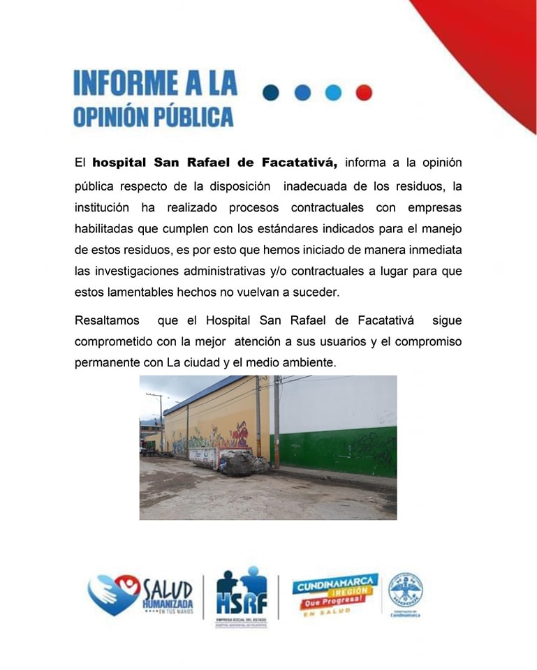 Facatativá, Hospital San Rafael investigara caso por la disposición inadecuada de residuos hospitalarios en inmediaciones de la plaza de mercado por mutantes tv · Publicada 25 marzo, 2023 · Actualizado 25 marzo, 2023 Share Post Whatsapp Según el Hospital San Rafael se iniciará de manera inmediata las investigaciones administrativas y contractuales a lugar para que estos lamentables hechos no vuelvan a suceder. COMUNICADO DE PRENSA HOSPITAL SAN RAFAEL Share Post Whatsapp