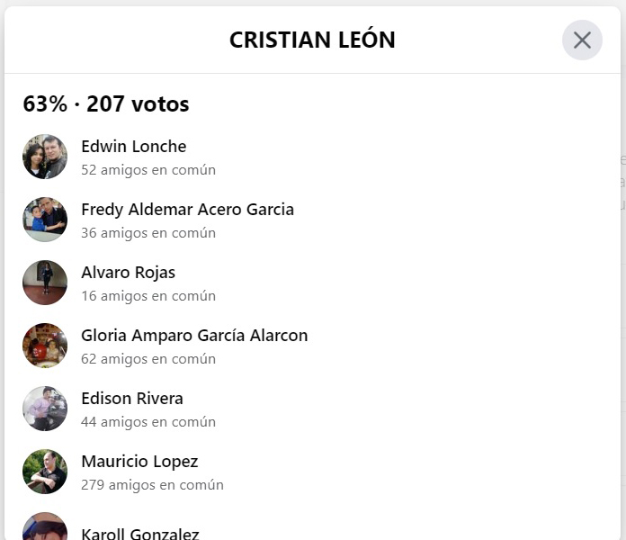 Ayer 15 de mayo nuestro medio de comunicación público un sondeo realizando la siguiente pregunta. Participe de nuestro sondeo. Según información de los dirigentes del Pacto Histórico en Facatativá, estos son los tres precandidatos más sonados para la Alcaldía de Facatativá. ¿Por cuál de ellos votaría para la Alcaldía de Facatativá? Recuerde que sus opiniones y comentarios son muy importantes para nosotros.En este sondeo el exconcejal Cristian León obtuvo un 63% de aceptación, seguido del Medico Hugo Sánchez con un 20%, mientras que Beatriz Fuentes representante del gremio floricultor obtuvo un 17%.Cristian León nació en Facatativá Cundinamarca, es Abogado de Profesión con especialización en Derecho Administrativo, especialista en Gestión Pública, Magister en Derecho Público, Exconcejal de Facatativá periodo 2012-2015, Asesor de entidades del orden departamental y distrital por más de 9 años, Docente Universitario de pregrado y posgrado .