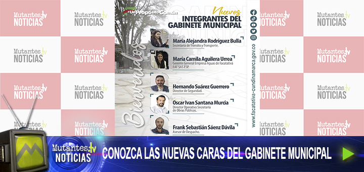 La Administración Municipal, liderada por el Alcalde Guillermo Aldana Dimas da la bienvenida a los nuevos integrantes del gabinete municipal. – María Alejandra Rodríguez Bulla, Secretaria de Tránsito y Transporte.– María Camila Aguilera Urrea, Gerente General de la Empresa Aguas de Facatativá.– Hernando Suárez Guerrero, Director de Seguridad.– Oscar Iván Santana Murcia, Director Operativo de la Secretaría de Obras Públicas.– Frank Sebastián Sáenz Dávila, Asesor de Despacho.