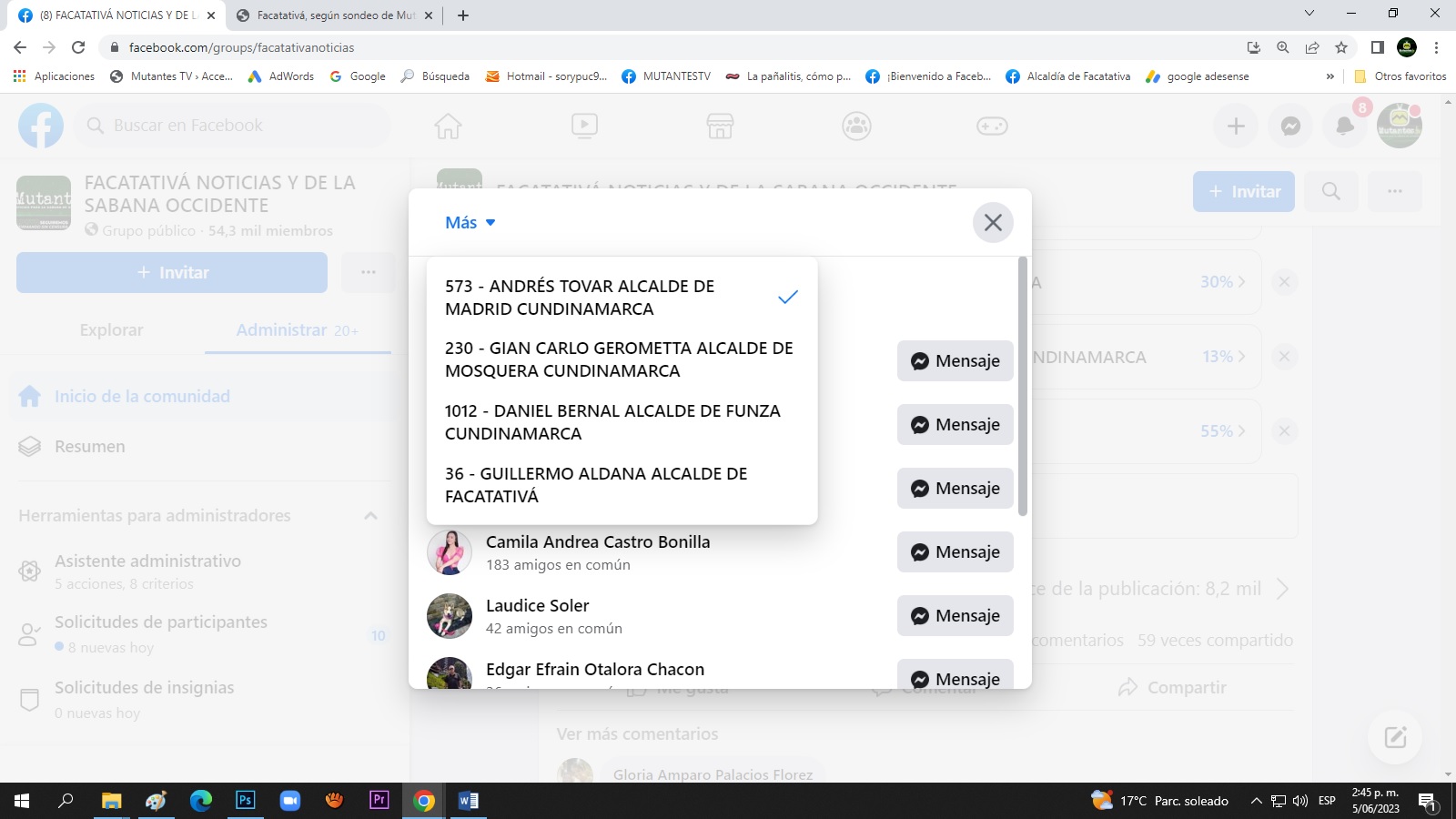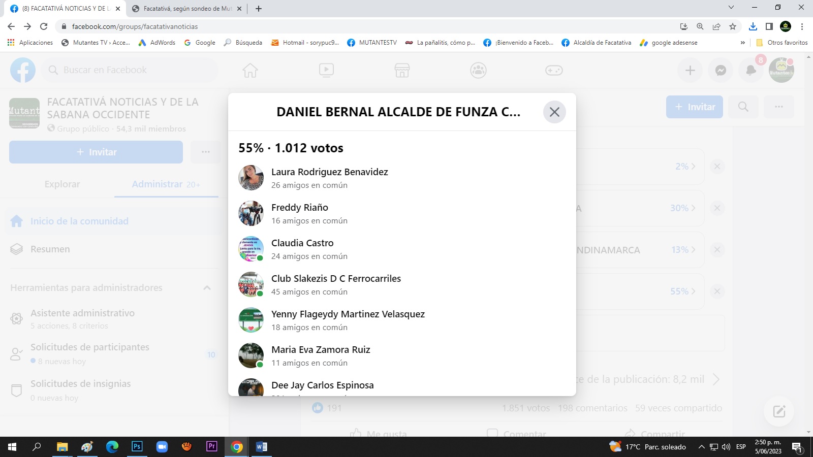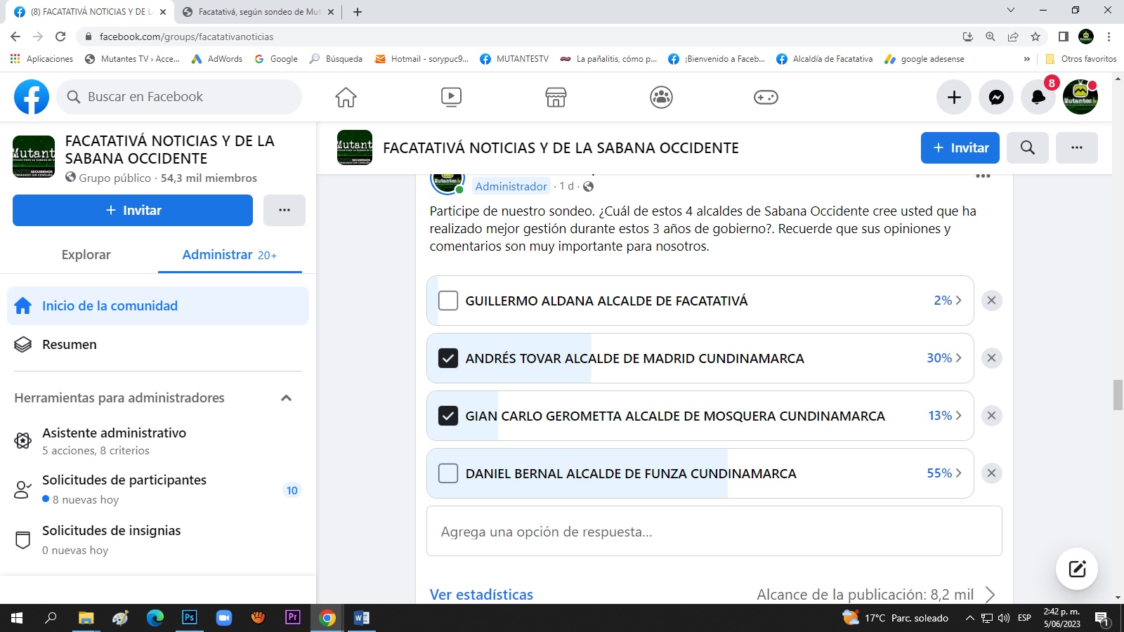 El pasado 3 de junio nuestro medio de comunicación realizo un sondeo con los cuatro alcaldes de los municipios con mayor población de Sabana de Occidente, Facatativá, Madrid, Mosquera y Funza Cundinamarca.Daniel Bernal Alcalde de Funza Cundinamarca obtuvo el mayor porcentaje del sondeo con un 55 %, seguido por Alcalde de Madrid Andrés Tovar con 30%, Gian Carlo Gearometta Burbano Alcalde de Mosquera obtuvo el 13 % de la votación y en el último lugar el Alcalde de Facatativá Guillermo Aldana con un 2% de la votación .