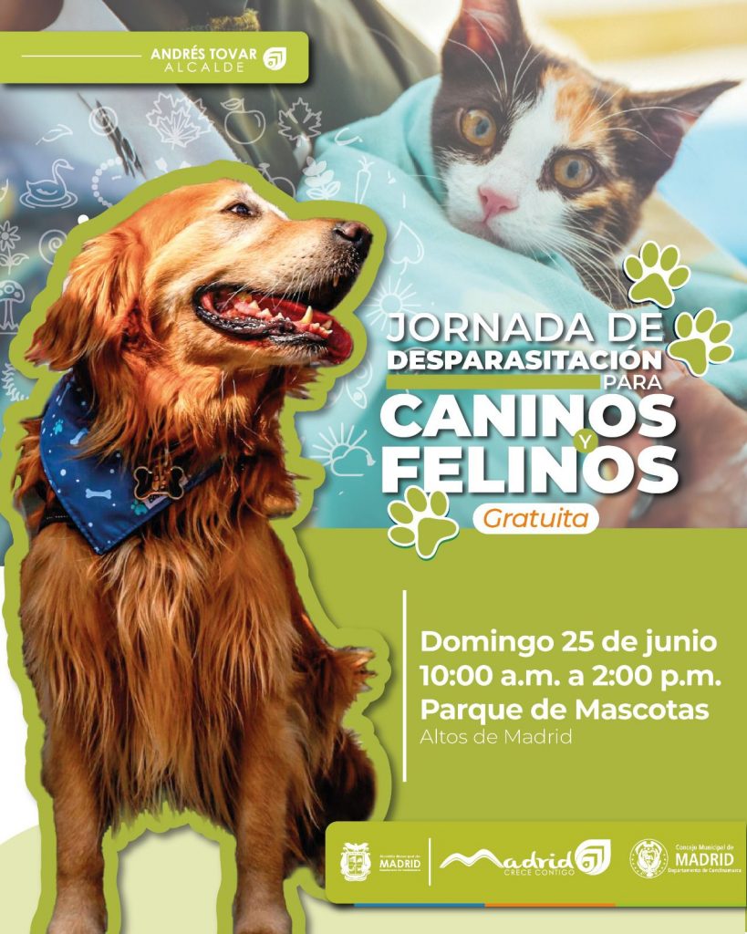 La Alcaldía de Madrid Cundinamarca, a través de la Secretaría de Desarrollo Económico, invita a todos los ciudadanos a participar en una importante jornada de desparasitación gratuita para caninos y felinos. Bajo el lema «Salud y protección para nuestras mascotas», la actividad se llevará a cabo el domingo 25 de junio, de 10:00 am a 2:00 pm, en el Parque de Mascotas, ubicado en el sector de Altos de Madrid.