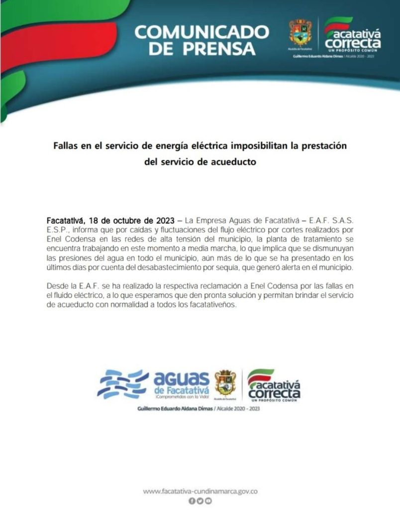 Alcaldía de Facatativá Cundinamarca a través de sus redes sociales asegura que por fallas en el suministro de energía y en redes de alta tensión se ha disminuido las presiones de agua en todo el municipio, lo que imposibilita a la Empresa de Aguas de poder dar sustento a varios sectores del municipio, afirman que se han enviado peticiones a la Empresa de energía Enel Colombia y no se ha tenido una respuesta que solucione la problemática.