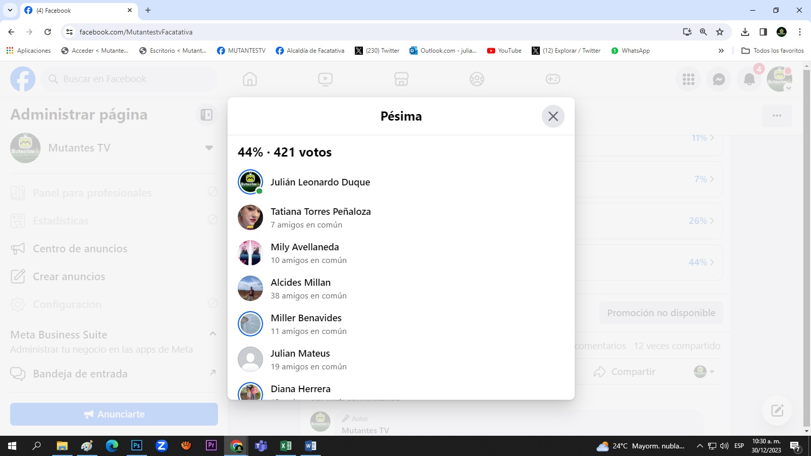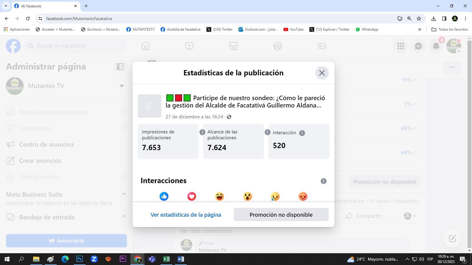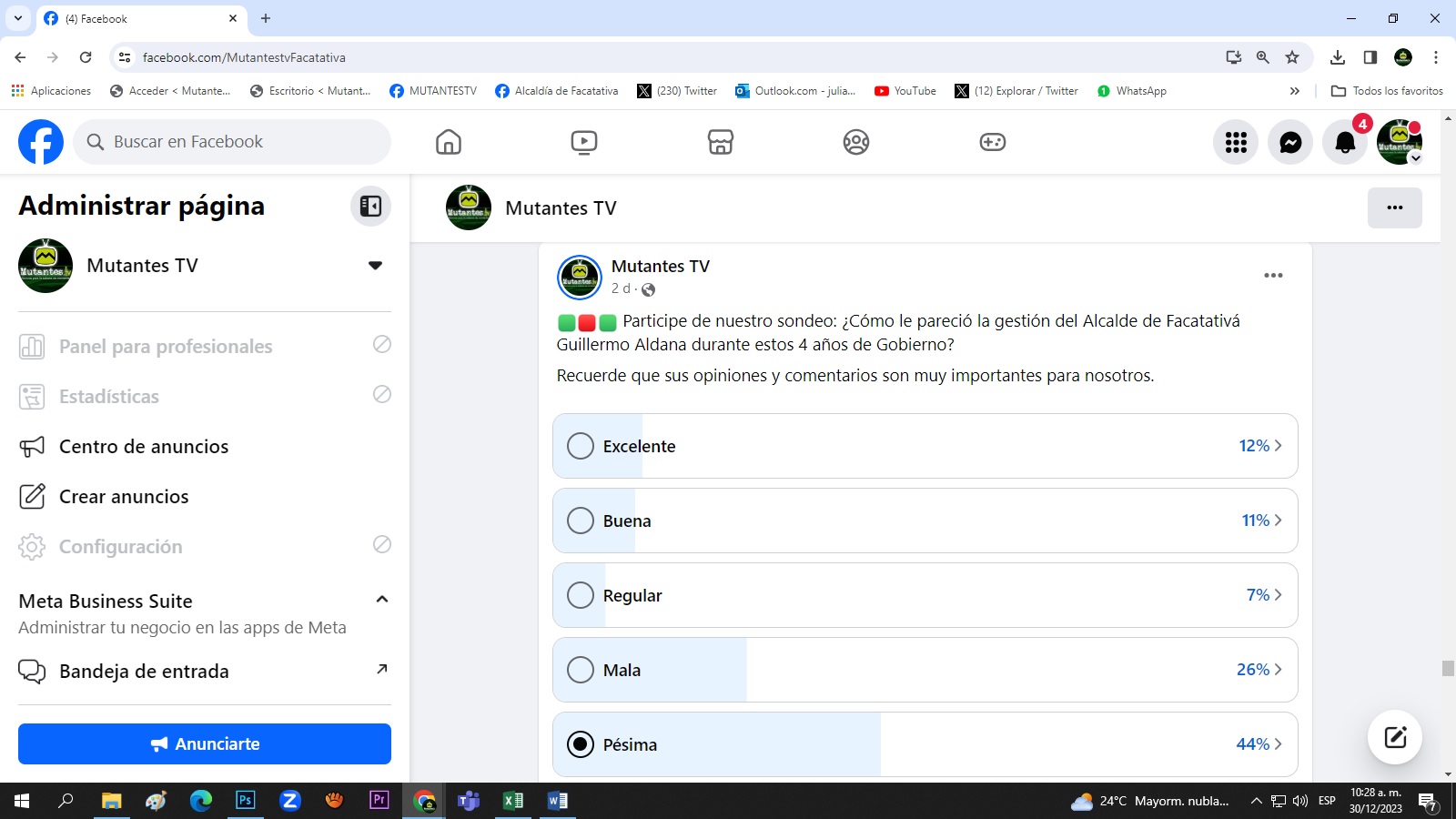El pasado 27 de diciembre nuestro medio de comunicación realizó un sondeo donde se les pregunto a los facatativeños lo siguiente. ¿Cómo le pareció la gestión del Alcalde de Facatativá Guillermo Aldana durante estos 4 años de Gobierno?, las mayores tendencias fueron pésima con un porcentaje del 44%, seguida de mala con un porcentaje del 26 %, regular 7%, buena 11 % y excelente 12 %, el sondeo tuvo un alcance 7.624 personas.
