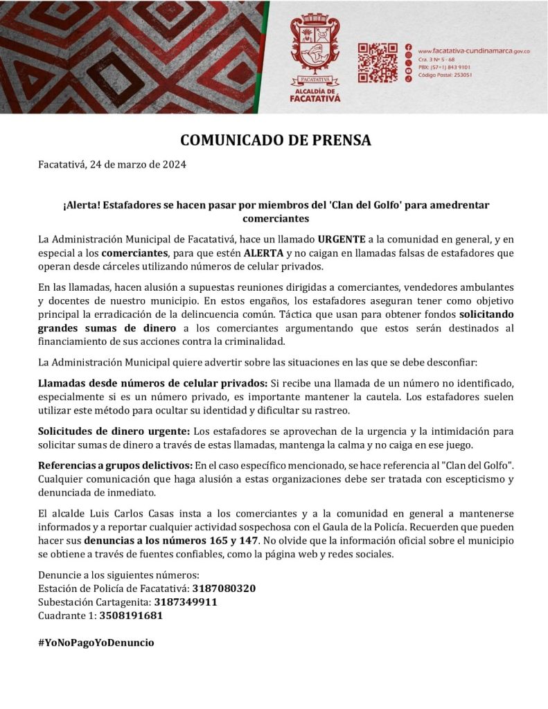 Facatativá, estafadores se hacen pasar por miembros del Clan del Golfo para amedrentar comerciantes por mutantes tv · Publicada 25 marzo, 2024 · Actualizado 25 marzo, 2024 Share Post Whatsapp COMUNICADO ALCALDÍA DE FACATATIVÁ Share Post Whatsapp