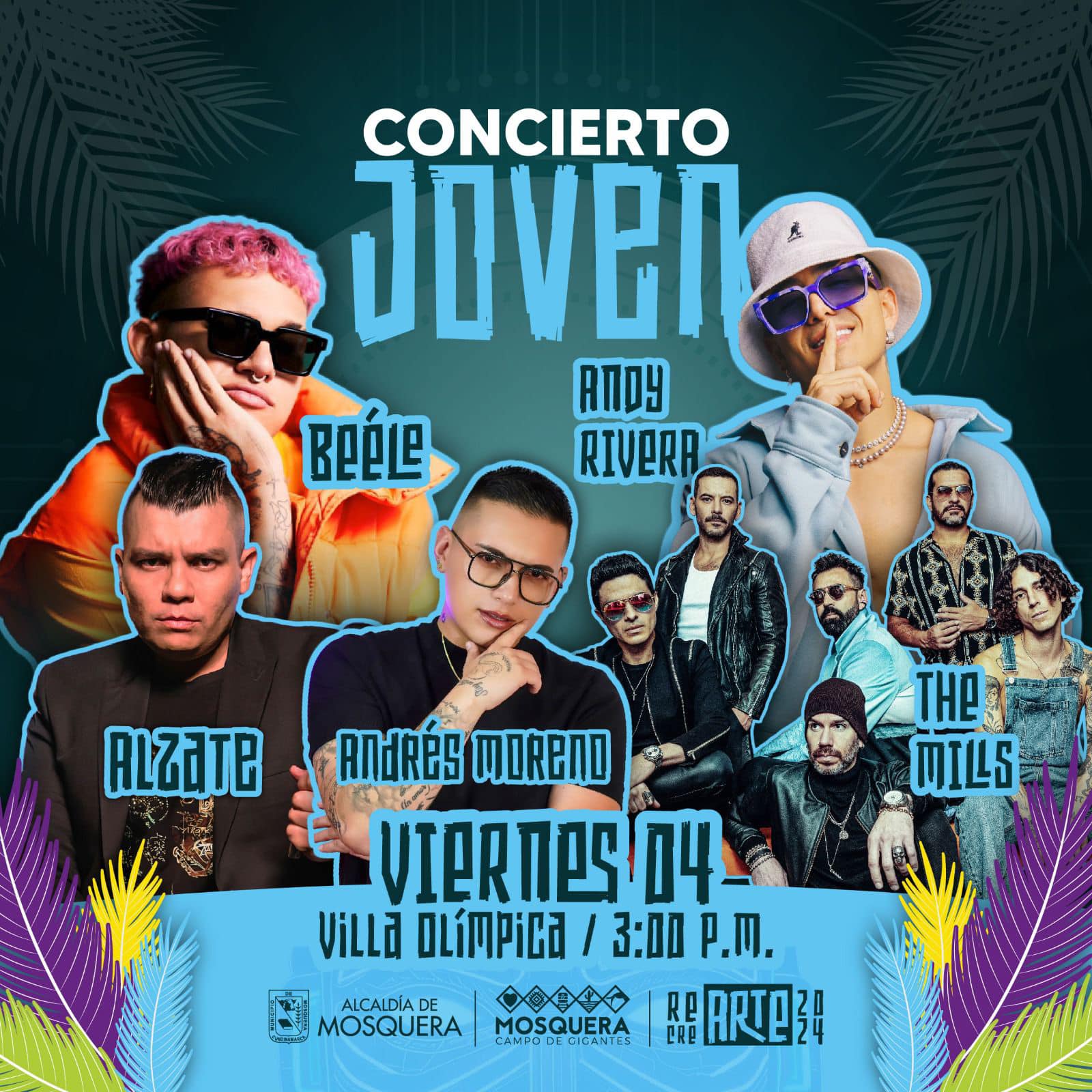 Este viernes 4 de octubre, el Concierto Joven tiene la mejor música. Andrés Moreno, The Mills, Alzate, Andy Rivera y Beéle estarán en tarima para hacerte saltar con sus grandes éxitos. El concierto se realizará en la Villa Olímpica a partir de las 3: 00 pm.