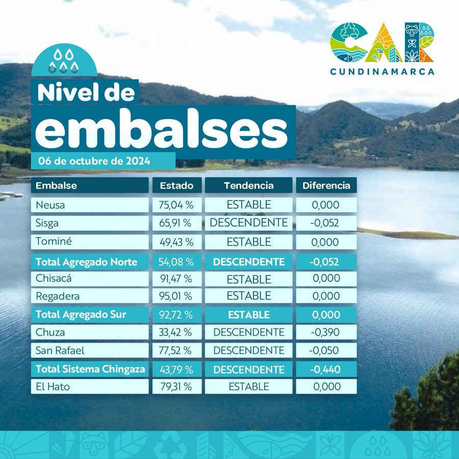 El pasado domingo 6 de octubre, la Corporación Autónoma Regional de Cundinamarca (CAR), informó sobre los niveles de los ocho embalses que tiene el departamento de Cundinamarca, en donde se reportó que tres de los embalses siguen con tendencia descendente, y los otros cinco con estabilidad. Aunque Colombia está viviendo la llegada de la temporada de lluvias, esta situación no ha sido un aliciente para la crisis de agua que se está viviendo.