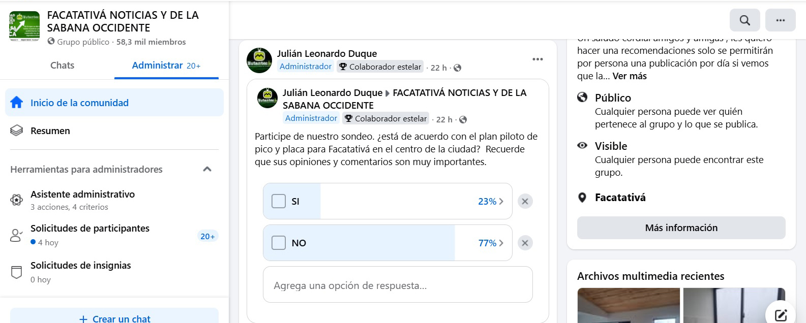 El 77 % de los facatativeños expresaron que no están de acuerdo, solo el 23% señalaron que si están de acuerdo con la medida. Este sondeo tuvo un alcance 1.840 personas donde 235 ciudadanos votaron por la opción del NO y 68 votaron por la opción del SI PARA UN TOTAL DE 303 VOTOS.
