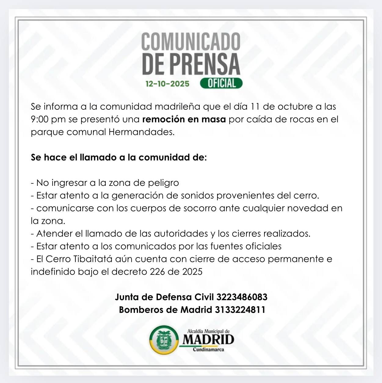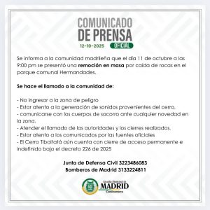 Desde la Administración Municipal y el Área de Gestión de Riesgo del Municipio de Madrid se informa a la comunidad madrileña y en especial a los residentes cercanos al Cerro Tibaitatá que el dia 11 de octubre a las 9:00 pm se presentó una remoción en masa por caida de rocas en el parque comunal Hermandades.