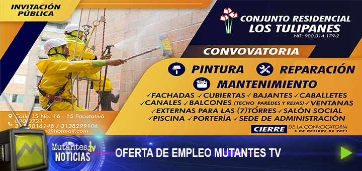 OFERTA DE EMPLEO MUTANTES TV La convocatoria se realizará hasta el próximo 5 de octubre interesados enviar sus hojas de vida o llamar a los siguientes números 8900721- 3115016148- 3138299106.