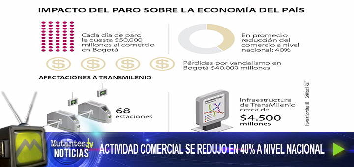 En los días de marchas la actividad comercial se redujo en 40% a nivel nacional y solo en Bogotá, Fenalco calcula pérdidas diarias de $50.000 millones para los comerciantes Colombia lleva siete días de...