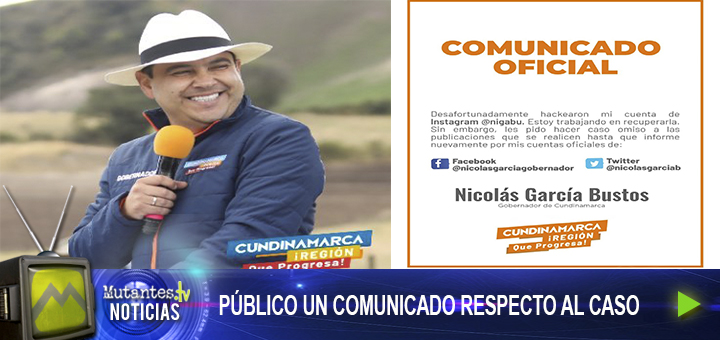 A través de sus redes sociales oficiales el Gobernador de Cundinamarca Nicolás García Bustos señalo que su cuenta de Instagram fue hackeada en las últimas horas, por estos hechos público el siguiente comunicado. ...