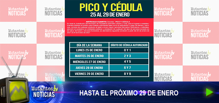 Tenga en cuenta que hasta el próximo 29 de enero habrá toque de queda y ley seca, en horario de 08:00 P.M. hasta las 05:00 A.M.. Recordamos a la ciudadanía que el horario para...